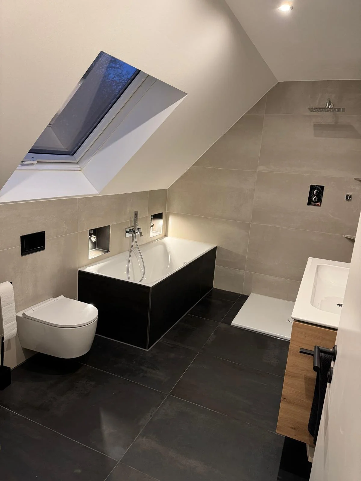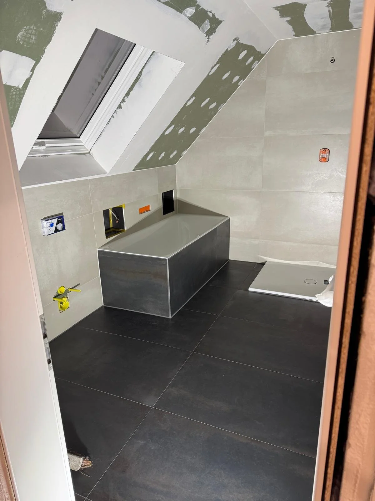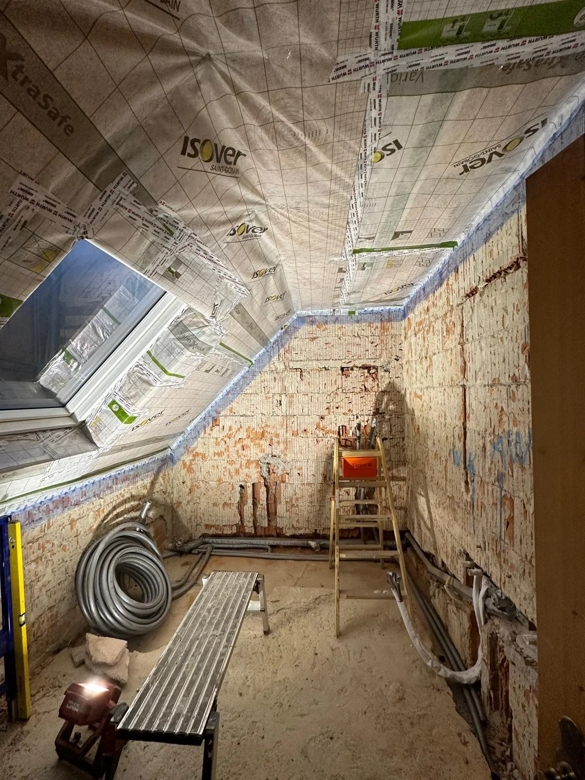 Badsanierung mit Dachdämmung, Gipskartondecken und Vorsatzschale.